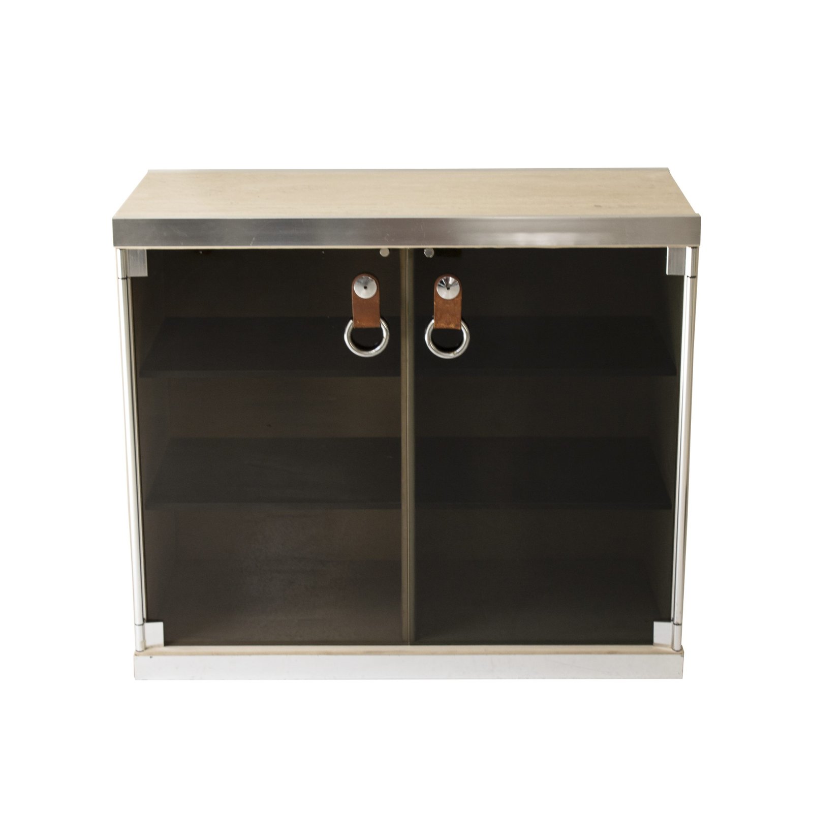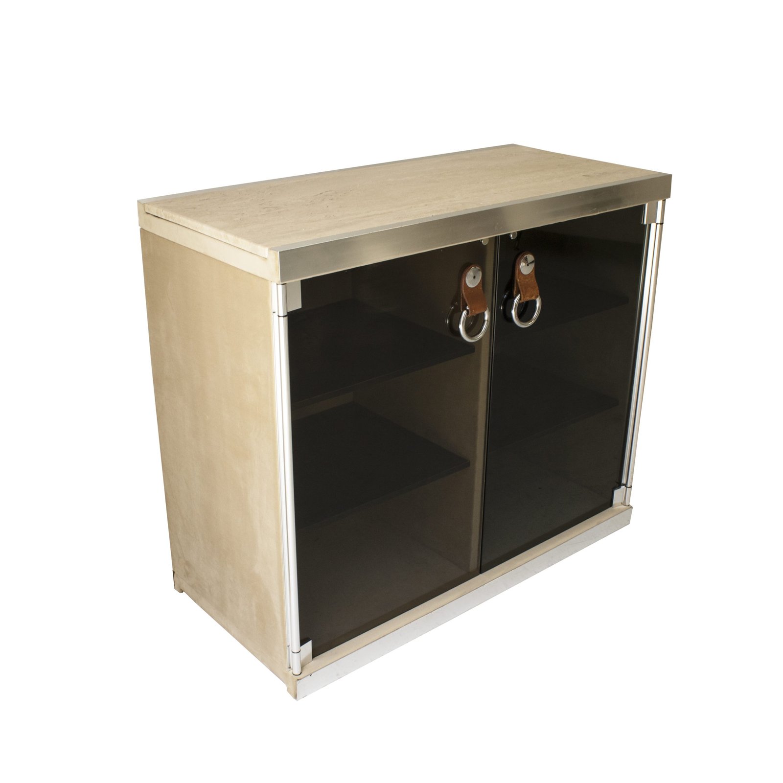 Aparador de madera y metal con puertas de cristal y tapa de travertino, diseñado por Guido Faleschini para Hermés. Está dividido en dos secciones, cada una compuesta de una puerta de cristal tintado, con tirador de cuero y metal y tres estantes de madera pintada de negro. La madera del interior y exterior está cubierta de ante de color camel claro.