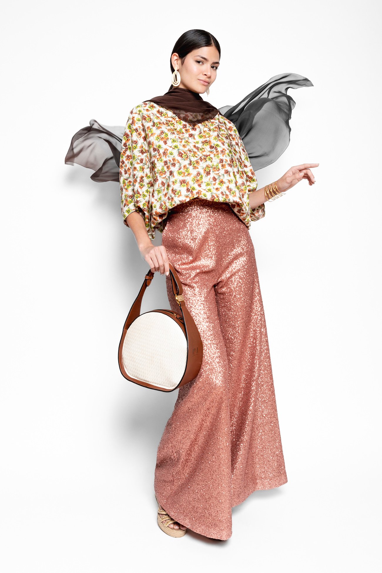Bolso redondo de tamaño mediano, asa regulable para mano y hombro, con bolsillo interior con cremallera. Piel marrón 100% vacuno, combinado con piel blanca con grabado de efecto esterilla y acabado nacarado