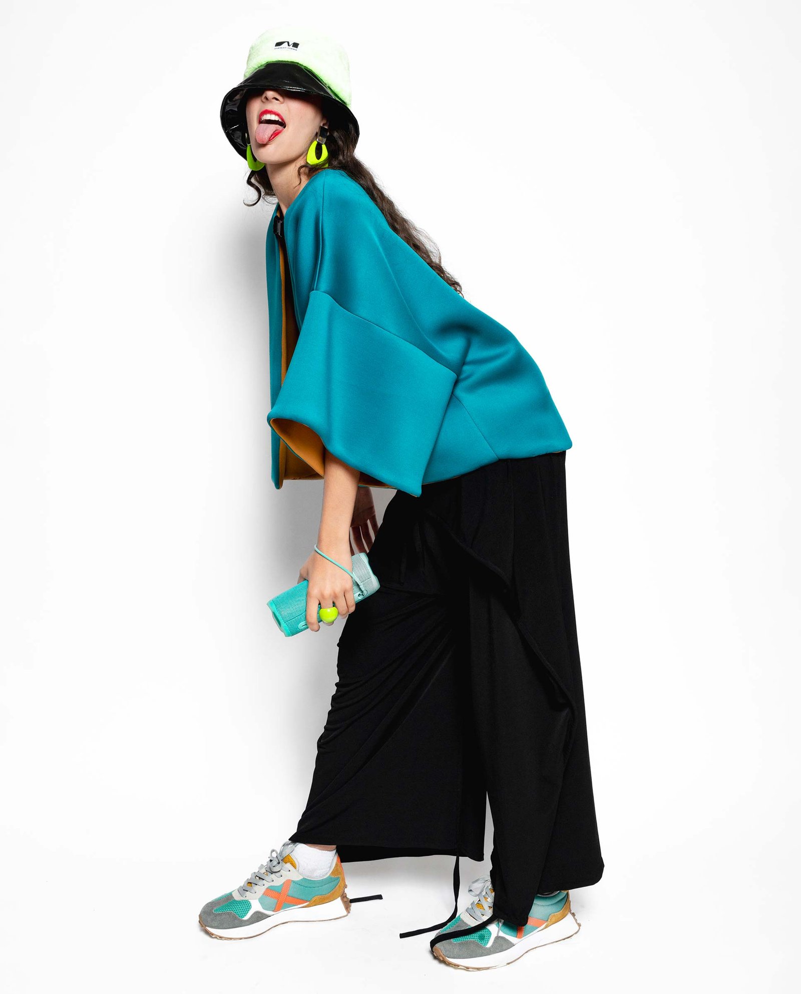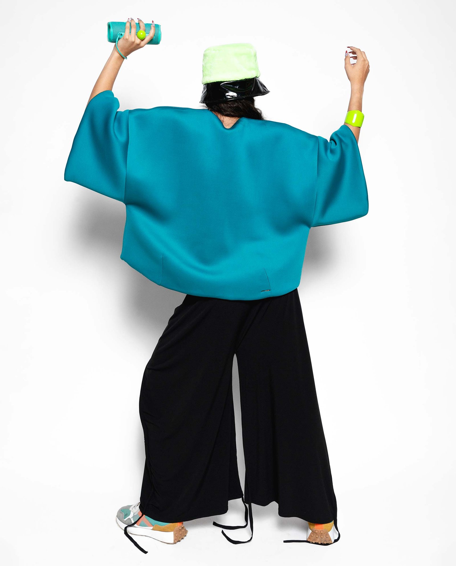 Chaqueta corta de escote caja, sisa caída y manga volumétrica, reversible en tejido tipo neopreno en color petróleo y camel