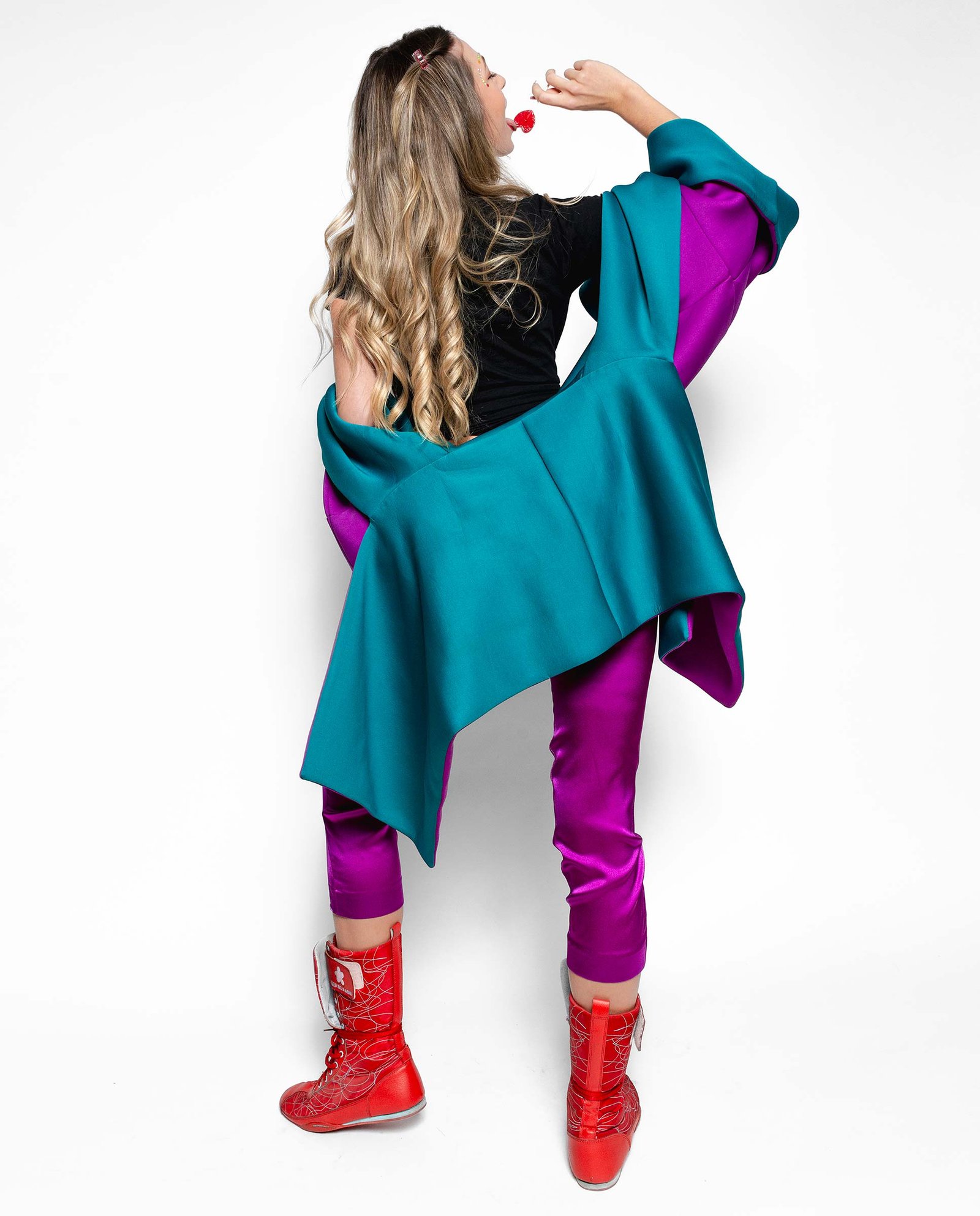 Chaqueta tipo kimono con cuello vuelto, reversible, realizada en tejido tipo neopreno en color fucsia y petróleo.