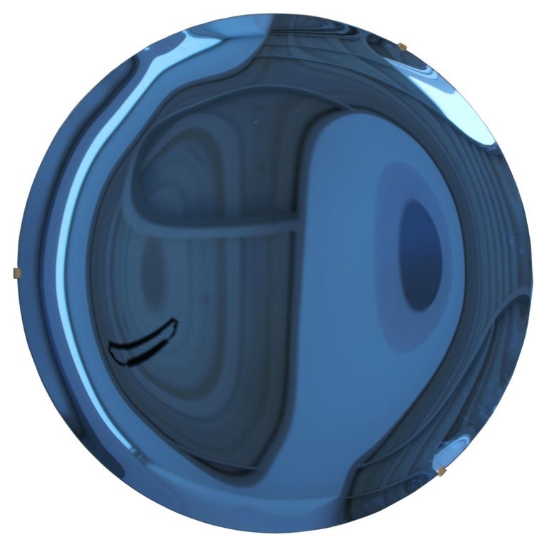 Espejo cóncavo de cristal de Murano azul elaborado de forma artesanal en un tamaño único de 130 cm de diámetro, con borde biselado y estructura trasera de latón para colgar en la pared.
