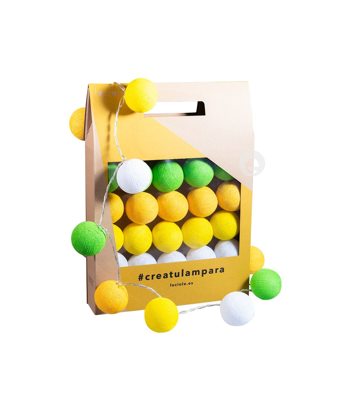 Kit de 20 bolas con 20 bolas en tonos amarillos inspirada en la tierra canaria. La longitud del cable con bolas es de 2,70 cm, con 14 cm de distancia entre las bolas y 1,5 m de longitud del cable hasta la clavija. El cable es transparente, incluye interruptor y clavija.