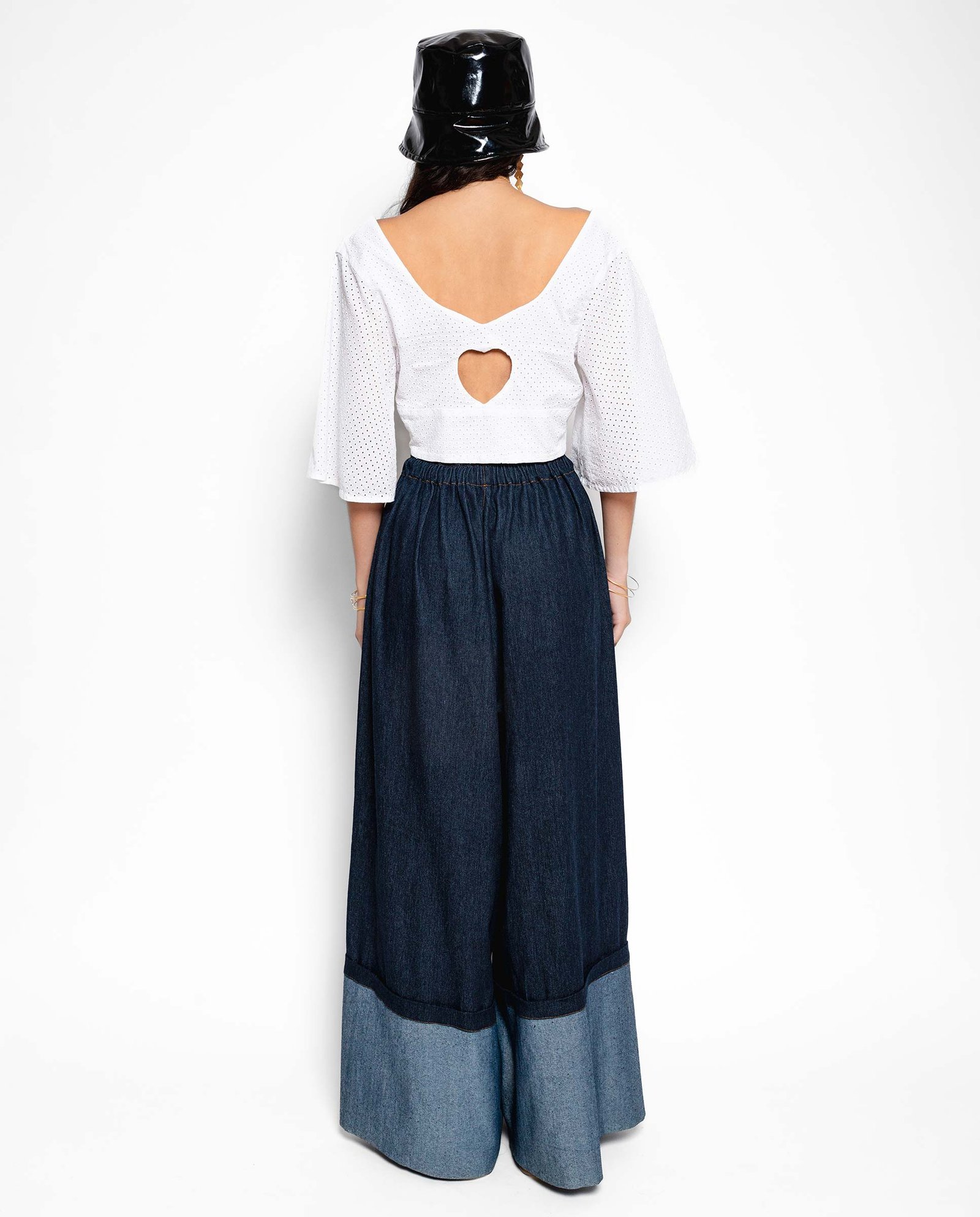 Pantalón vaquero con cintura de goma, bolsillos de vivo y vuelta en bajo.