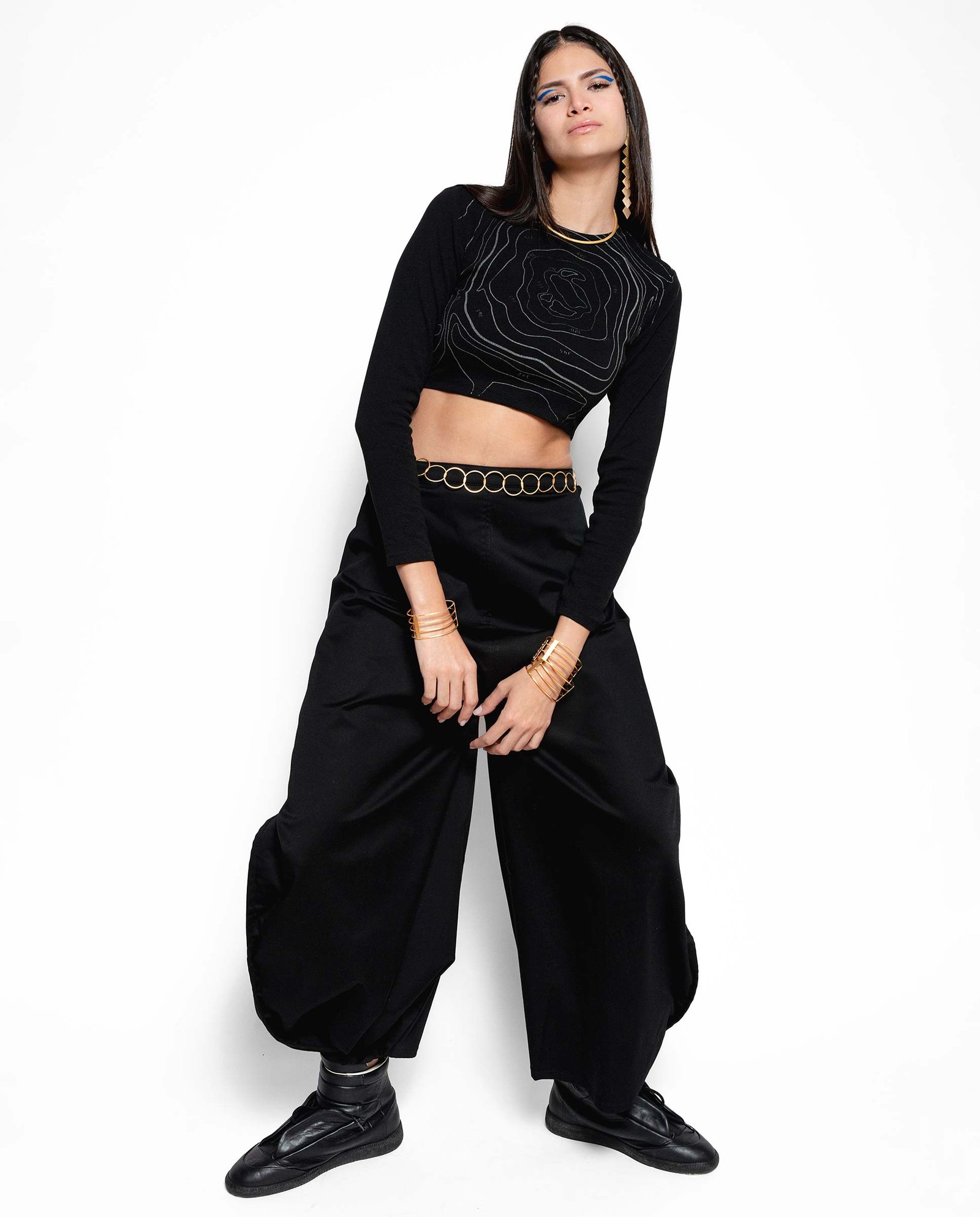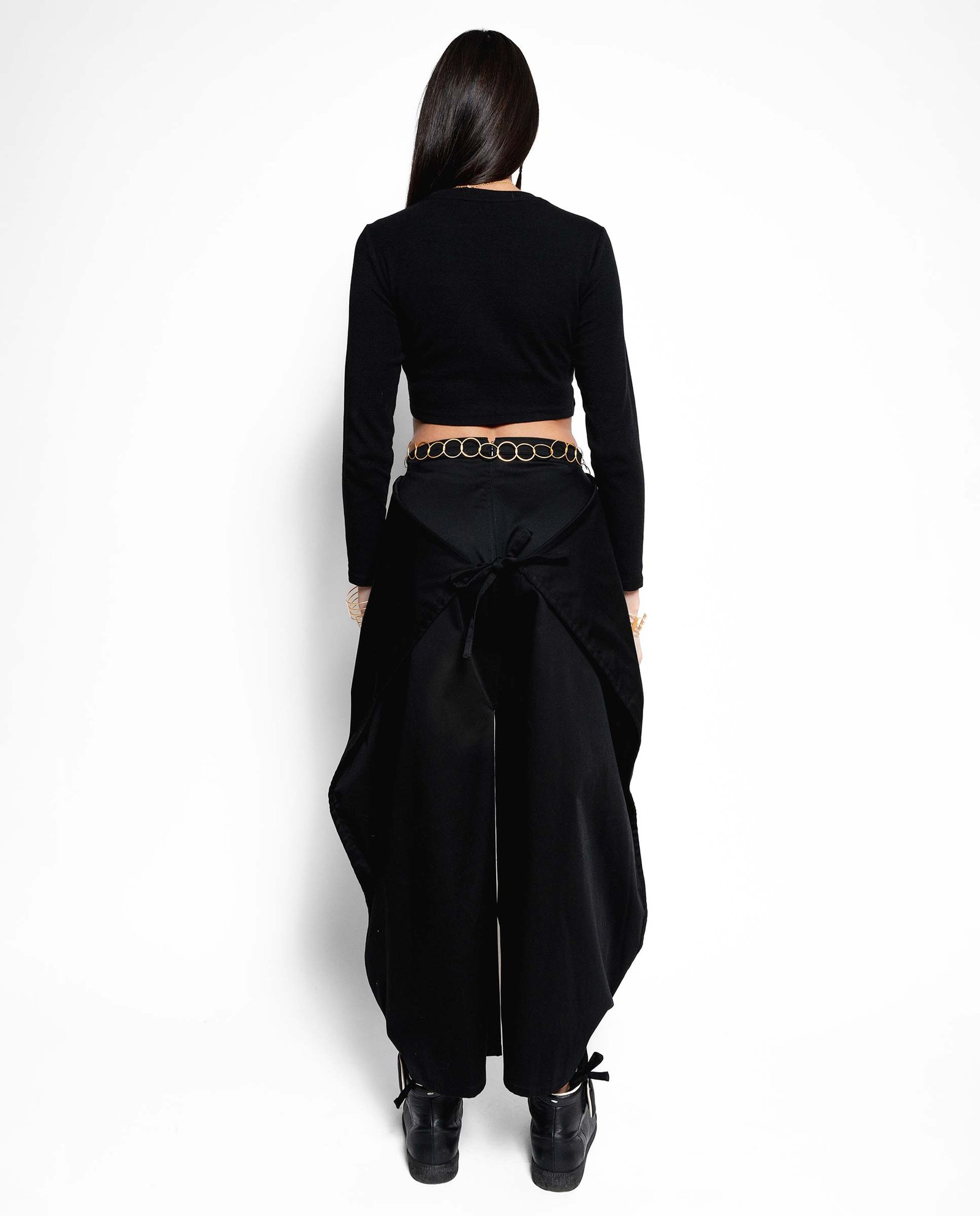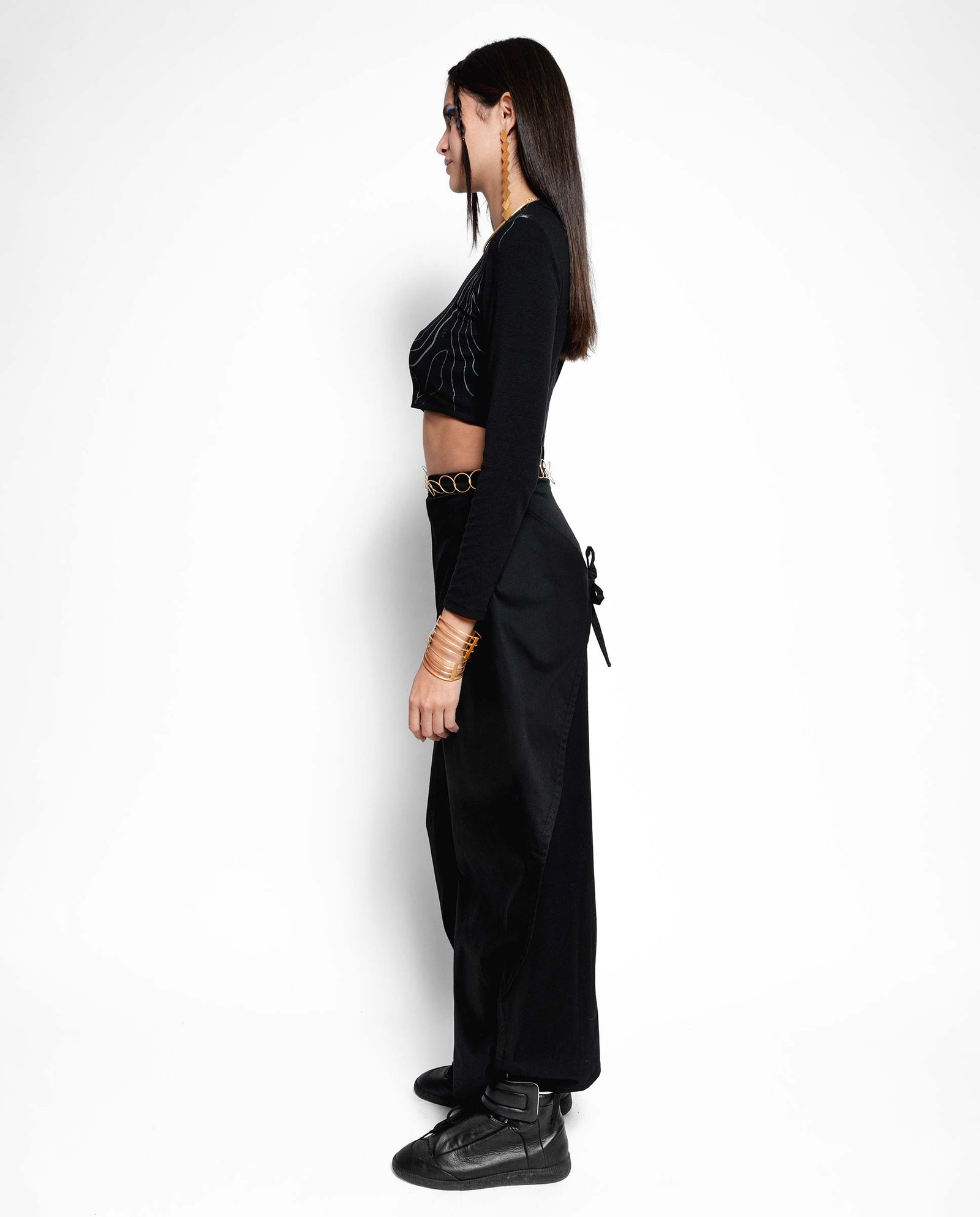 Pantalón amplio transformable, de forma rectangular con tiras en cadera y bajo para generar diferentes siluetas. Realizado con patrón Zero Waste Fashion, que optimiza el ancho completo del tejido.