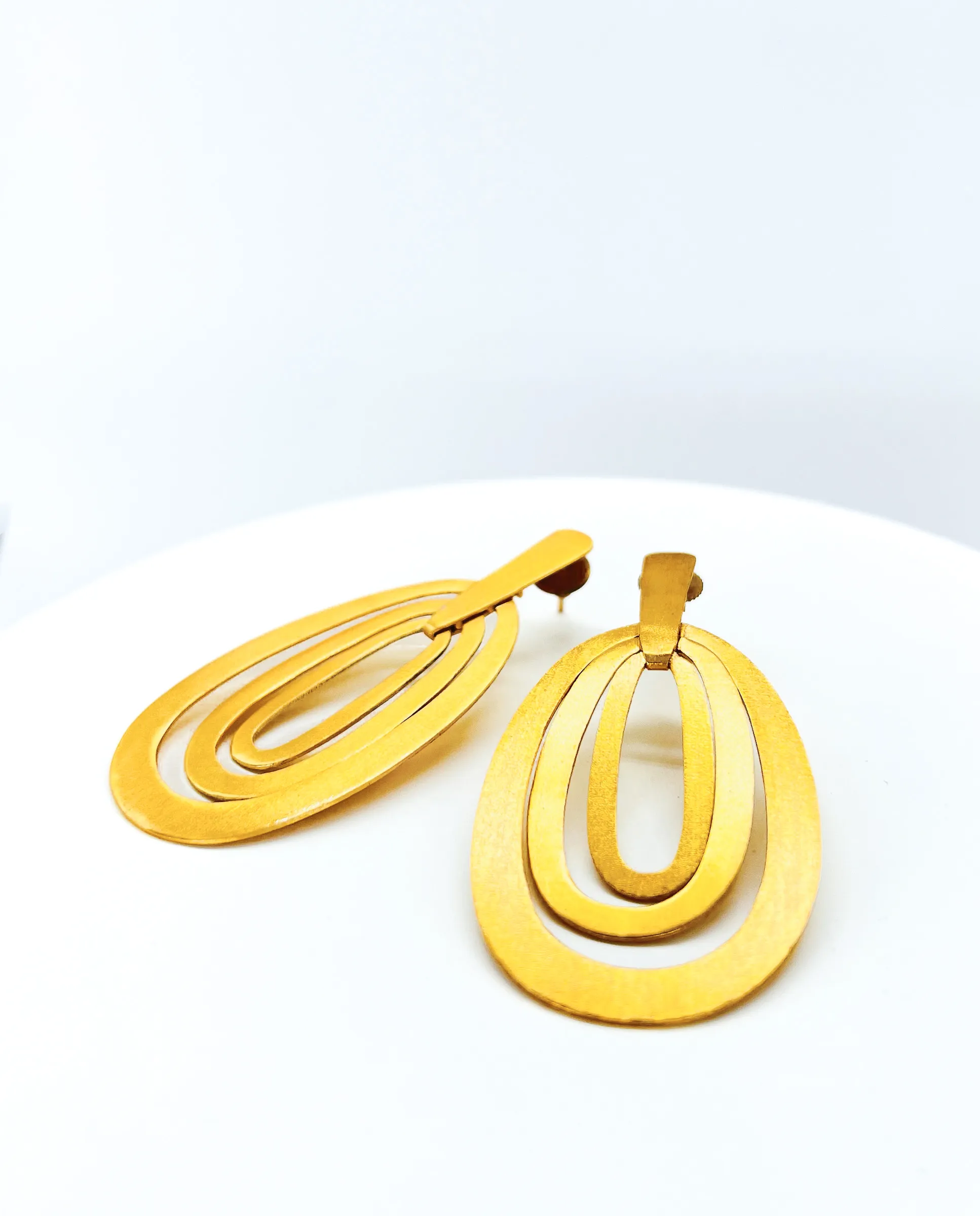 Pendientes ovalados concéntricos de 7cm de alto, realizado en Brass con baño de plata color dorado.