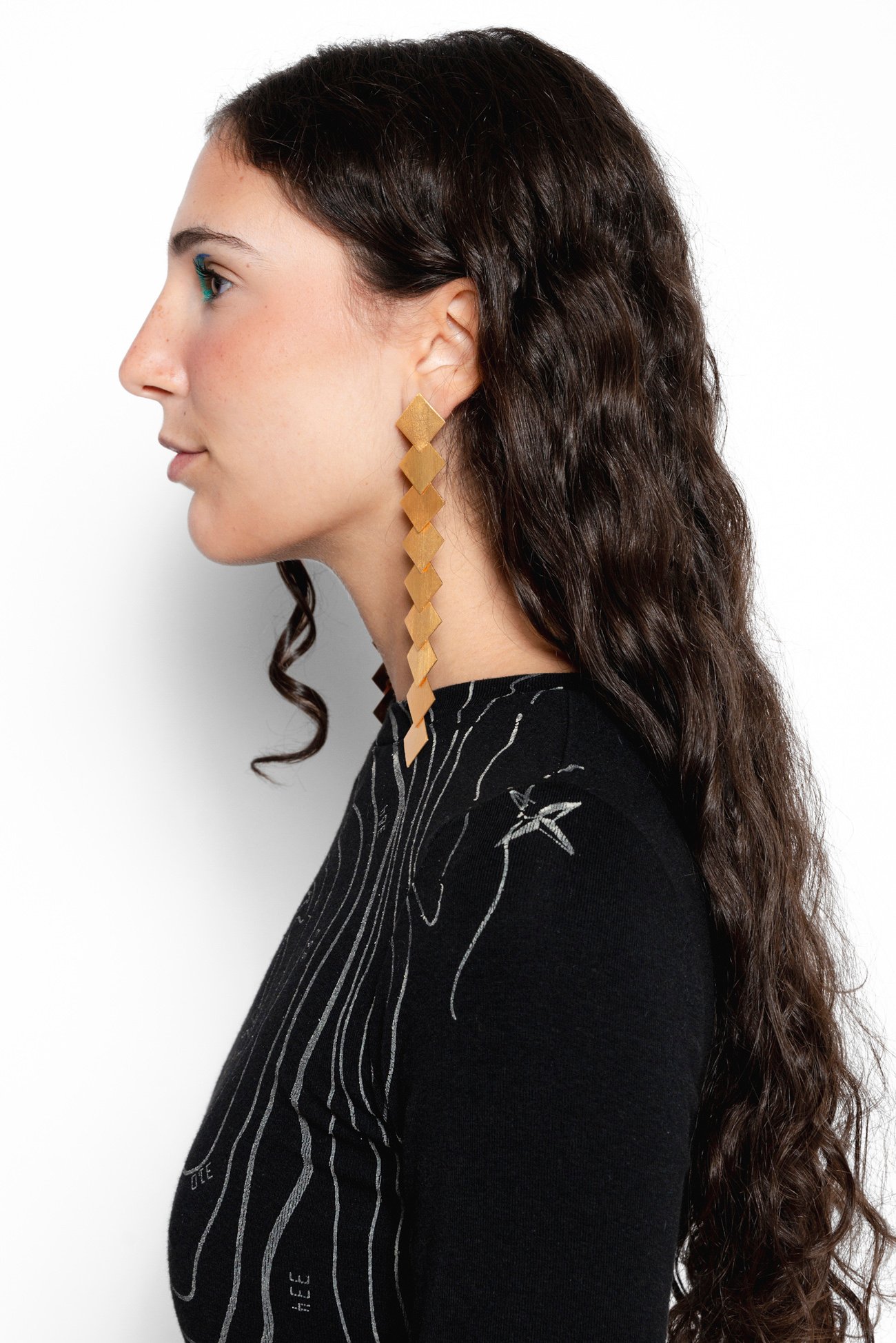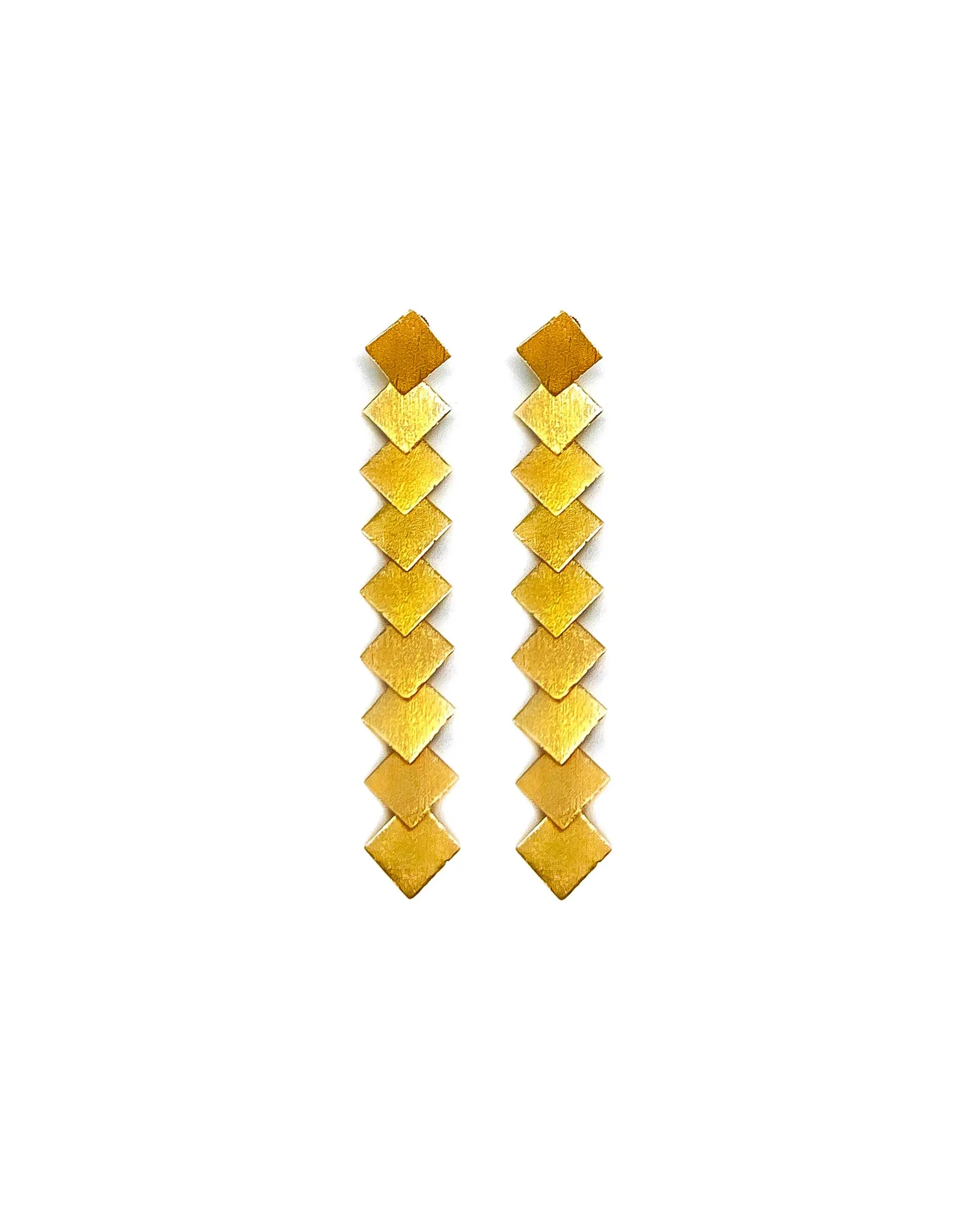 Pendientes de 14 cm de largo compuestos de rombos superpuestos, realizados en brass con baño de plata color dorado