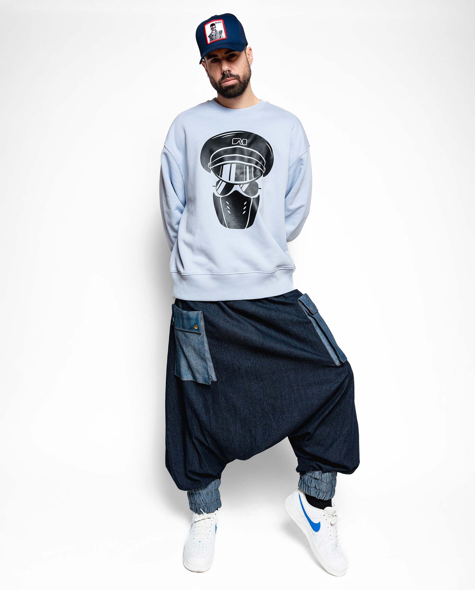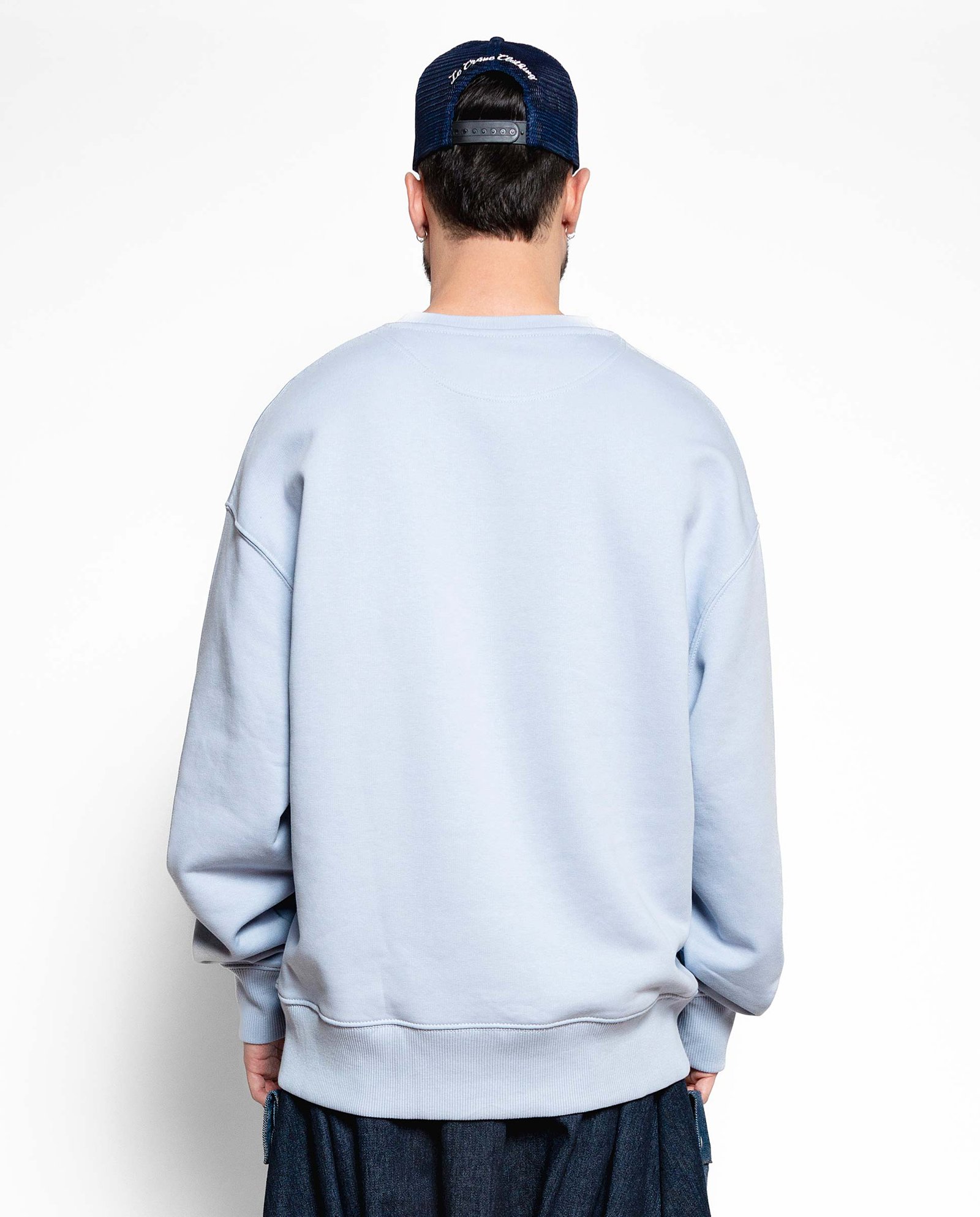 Sudadera de corte suelto y manga caída con cuello, puños y bajo en canalé 2×2, bies posterior de espiga en el cuello.