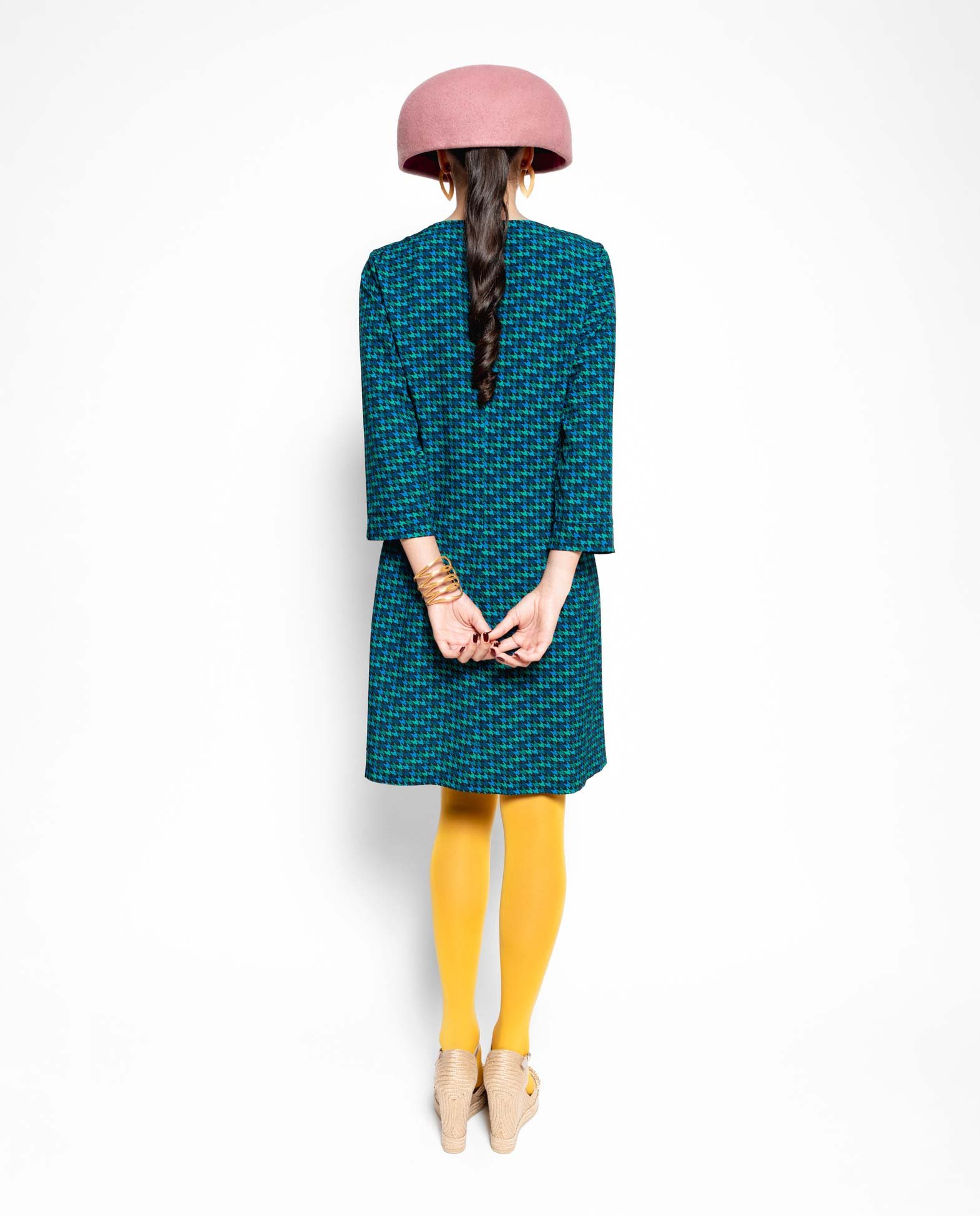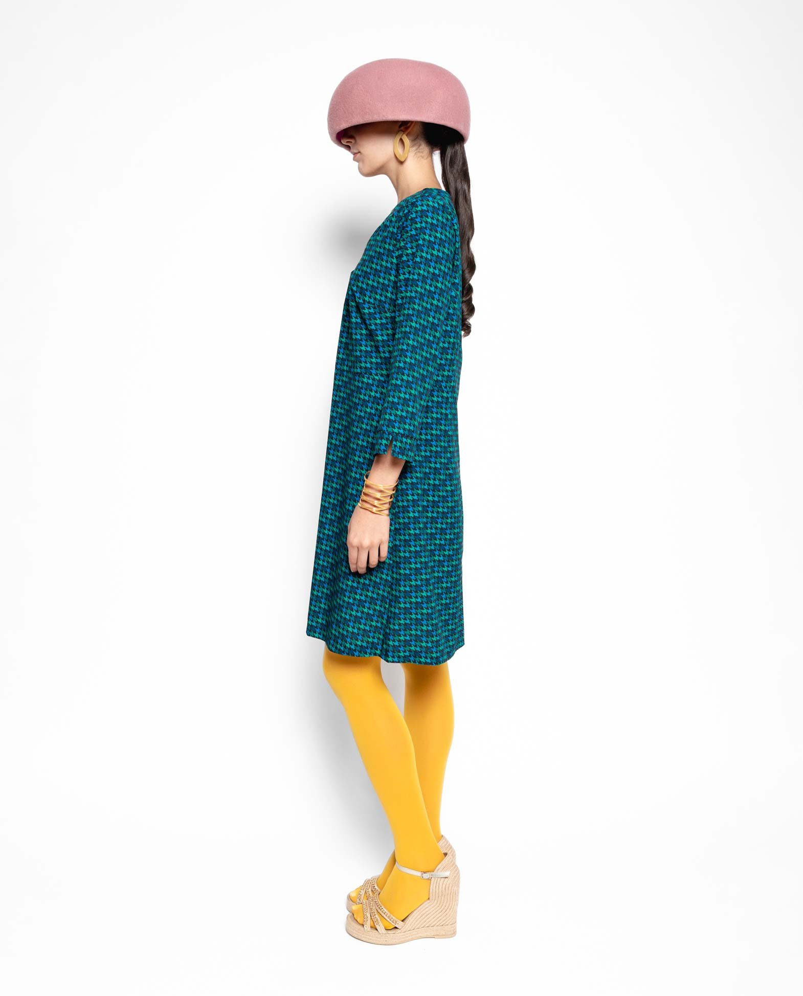 Vestido corto estampado de línea evasé con manga 3/4 y abertura en escote redondo